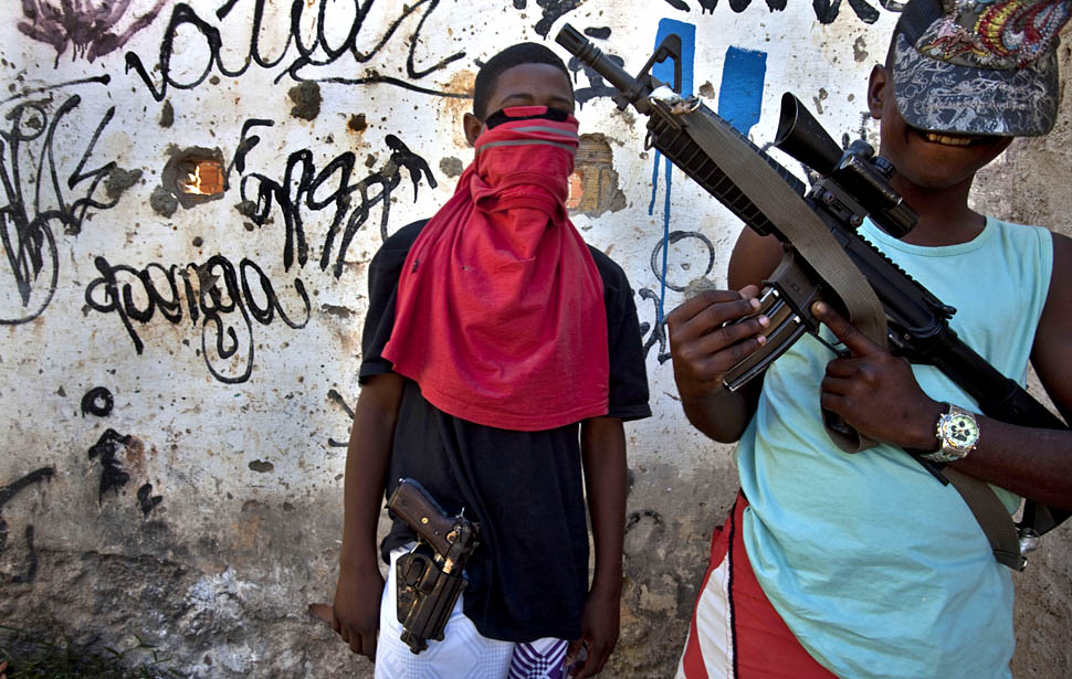 Rio de Janeiro, Brazil August 26, 2012 Two teenagers pose with their weapons in the favela of Antares which lies at the very edge of Rio de Janeiro’s municipal boundary. Residents of Antatres don’t believe the police will ever “pacify” their favela citing its distance from tourist areas and future Olympic venues. It is controlled by drug gangs who openly sell cocaine, marijuana and crack in the neighborhood streets.